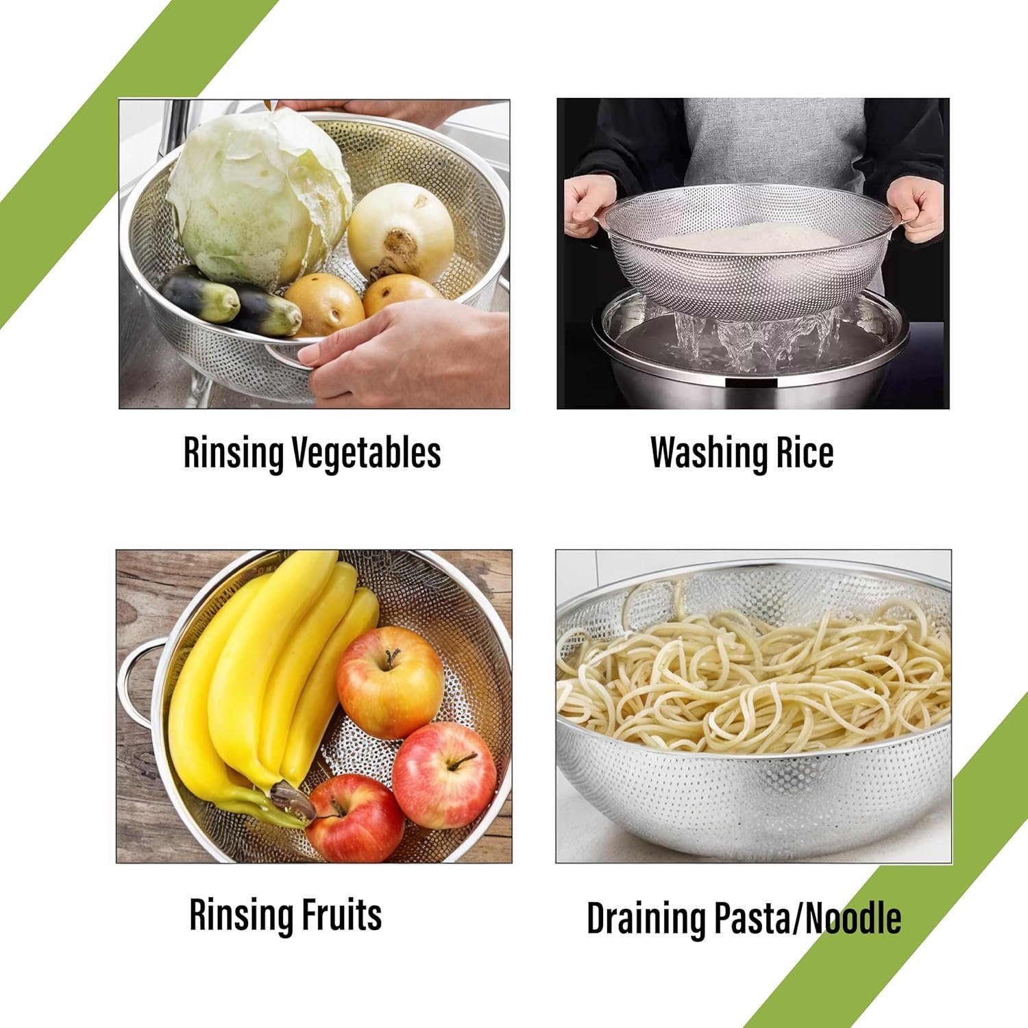 - Small and closely spaced holes on every surface of every perforated colander great for draining fast, and the food won’t be clogged up or slid out.