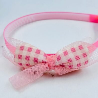 pink headband designed for children, featuring a bow detail. The headband has a thin, light pink band, possibly made of plastic, with a textured inner surface to help grip the hair. The bow is made of a pink and white checkered fabric, with a layer of pink tulle overlaying it, adding a delicate touch. The bow is positioned off-center, giving the headband a playful and stylish look. This accessory is likely intended for young girls and would be suitable for everyday wear or special occasions.